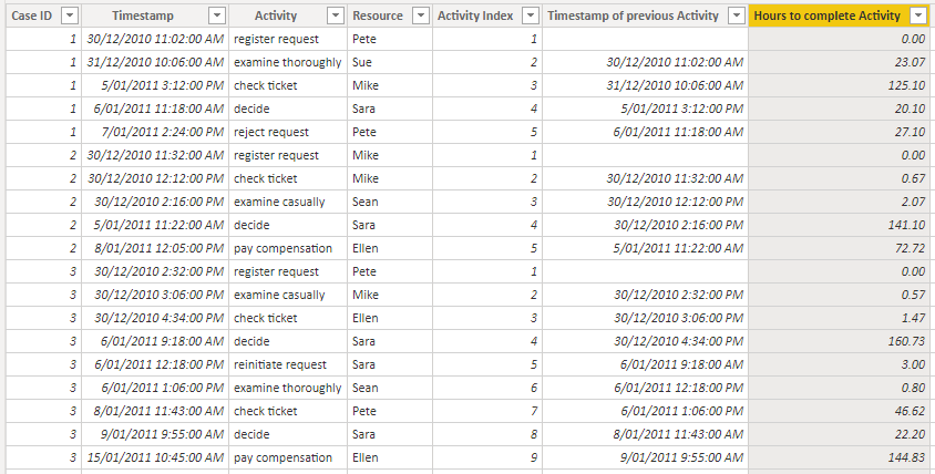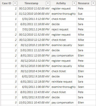 Here we have an event log which describes a compensation request process for an airline 1 . Each row represents an activity for a particular case, with the time of the activity and the airline staff member undertaking the activity also recorded.