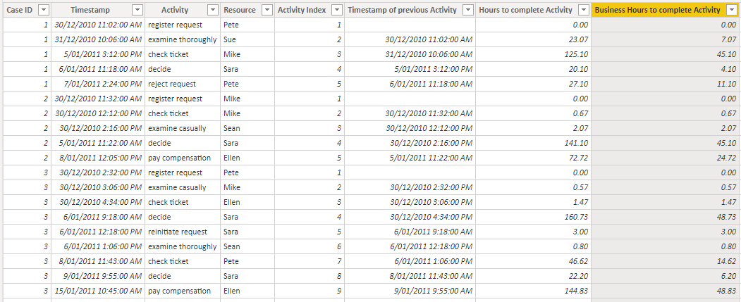 In a real world scenario, you may not be concerned about the hours spent waiting to complete an activity if those hours are outside business hours. To give a clearer picture of the process, we can adapt an established technique for Calculating Business Hours Using DAX, as written about previously by Matt Allington. Our event log has events happened between 9AM and 5PM, 7 days a week, so we’ll include weekends as Matt has done in his example (we will also not remove public holidays for simplicity).