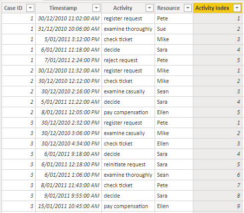 For this column, we will use the RANKX function to define the order in which each activity occurs. This will be done separately for each case, so that the first activity for each case (‘register request’) will always be indexed as 1.