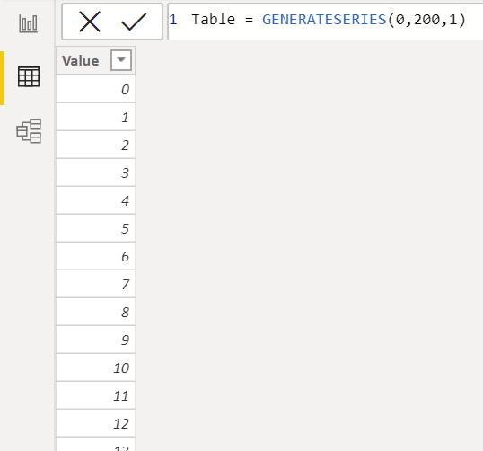 To build out a measure to include the ordinal suffix, we need a field that returns a list of numbers. To keep things simple, we can generate this list using a calculated table.