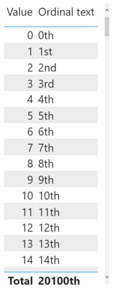 Note here that I’ve chosen to use a SUM aggregation in my measure, rather than using SELECTEDVALUE. This is intentional, since we may want to do some calculations and arrive at a new number before finding and applying the suffix. You can see the effect of this in the totals row of the visual. The sum of all the values in the table is computed as 20100, and then the logic in the measure determines that the appropriate suffix for this measure is ‘th’, so it presents the final output as a string that reads “20100th”.