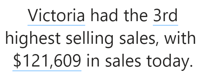 In using the Smart Narratives feature for Power BI, I’ve found a few tricks to make your narratives even easier to read. One trick I’ve used is to show values in a ranking in a more readable fashion. For example, say you used Smart Narratives to show the sales performance for a given state. If the state of Victoria came in 3rd best for sales by each state, then you might want your narrative to return something like this…